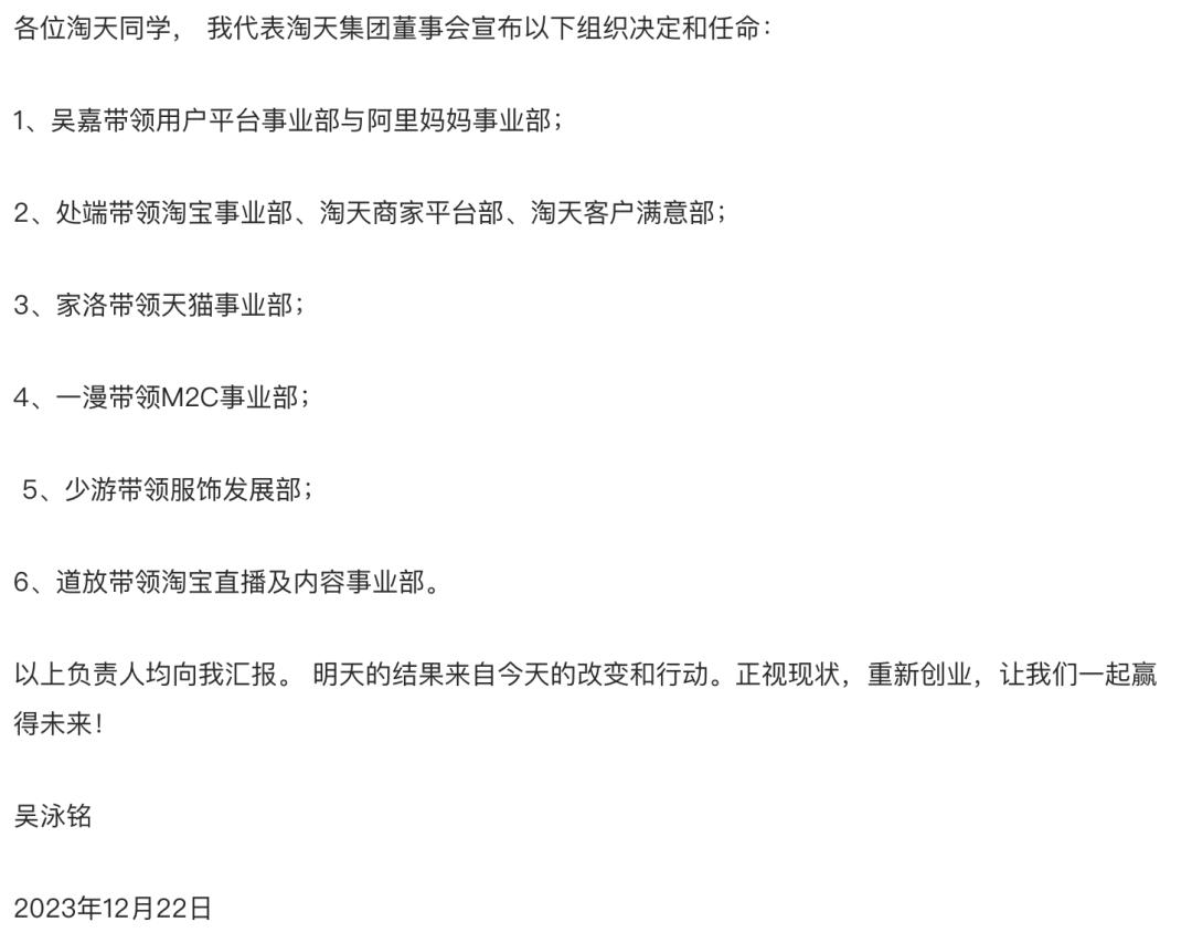 而另一大重要调整则是人事,80后成为淘天集团的主力军。淘天集团全员信显示,吴嘉带领用户平台事业部与阿里妈妈事业部;处端带领淘宝事业部、淘天商家平台部、淘天客户满意部;家洛带领天猫事业部;一漫带领M2C事业部;少游带领服饰发展部;道放带领淘宝直播及内容事业部。