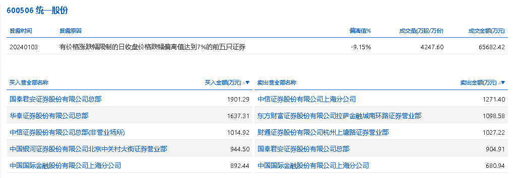 1月3日,统一股份今日跌8.98%,全天换手率达28.76%,振幅达8.98%。龙虎榜数据显示,营业部席位合计净买入1407.41万元。其中,中信证券上海分公司、东方财富证券拉萨金融城南环路证券营业部分别卖出1271.40万元、1098.58万元;国泰君安证券总部、华泰证券总部分别买入1901.29万元、1637.31万元。