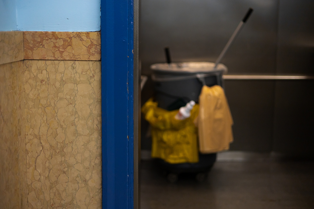 保洁员们没有权限乘坐白领上班时用的客梯,只能乘货梯。货梯的轿厢四壁被复合木板保护着,上面涂画了各种笔迹。连气味都不一样,带着尘土和汗水的味道。电梯上升和下降的时候,伴随着轰隆隆的噪音。很明显,这是一部专供像我母亲一样“做工的人”乘坐的电梯:保洁员带着拖把、水桶,快递员抱着摞得比自己脸还高的包裹,拉货员推着装满物品的推车,修理工背着工具袋……他们经常挤在一起,等着各自要去的楼层,脸上的表情总是很焦急。