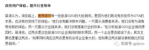 蒋涛认为,淘在路上、麦兜旅行等一些旅游O2O的大批倒闭,是因为他们既没有改变作为OTA的本质,也没有改变线下的体验。“他们没有解决根本问题,一方面从消费者来讲,他们没有为游客带来新的体验;另一方面从行业链来讲,他们没有提高行业的效率。”在分析旅游O2O企业倒闭原因时,蒋涛说,这两点是这些旅游O2O企业倒闭的根本原因,而一个企业是否能活下去,其实主要也是看这两点。“如果同时满足这两点是有机会将企业做大的,但如果这两点都没做到就比较容易倒闭。”