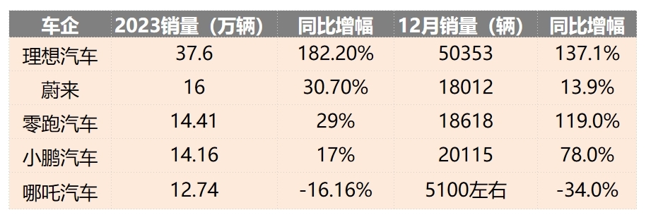 而上一年还被哪吒汽车甩在身后的“蔚小理零”,则全部完成了对于哪吒汽车的反超。