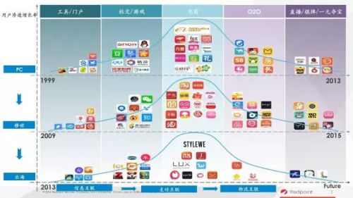 3)软件发展的第三个形态是电商,在此之前的工具、社交和游戏已经完成了用户在线和支付在线。此时用户渗透增长率达到顶峰;