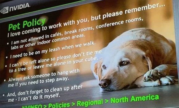 作为全球知名猫粮狗粮生产商,玛氏也允许无暇照顾宠物的员工带爱宠一起上班,并且在厂区和办公室内建立了狗狗乐园和猫屋,宠物们在这不仅可以好吃好喝,还可以与主人玩耍;NVIDIA公司不光允许,甚至鼓励员工带狗上班,其CEO表示:“正如我们所知,宠物狗容易(在员工上班期间)孤独。如果你想成为负责任的铲屎官,一种方式就是多陪伴。”当然,公司也提出了一些需要遵守的规范,比如不要只是把狗狗单独拴起来或关在笼子里,遛狗时要拴好狗绳,狗狗不能进入咖啡室、休息室、会议室、实验室等区域,而且员工要做好清洁工作等。