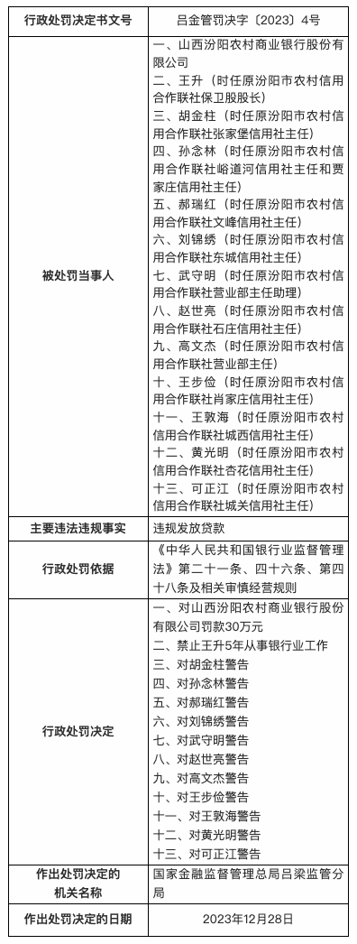1月4日,国家金融监督管理总局吕梁监管分局行政处罚信息公开表显示,2023年12月28日,山西汾阳农村商业银行股份有限公司因违规发放贷款,被处罚款30万元。