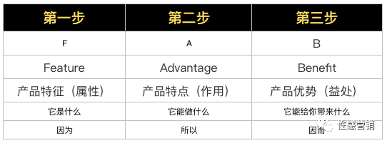 长期关注品牌的粉丝,对于品牌已经很熟悉,而且可能已经在使用品牌其他的产品,这个时候就可以用FAB法则来说服粉丝购买新产品。