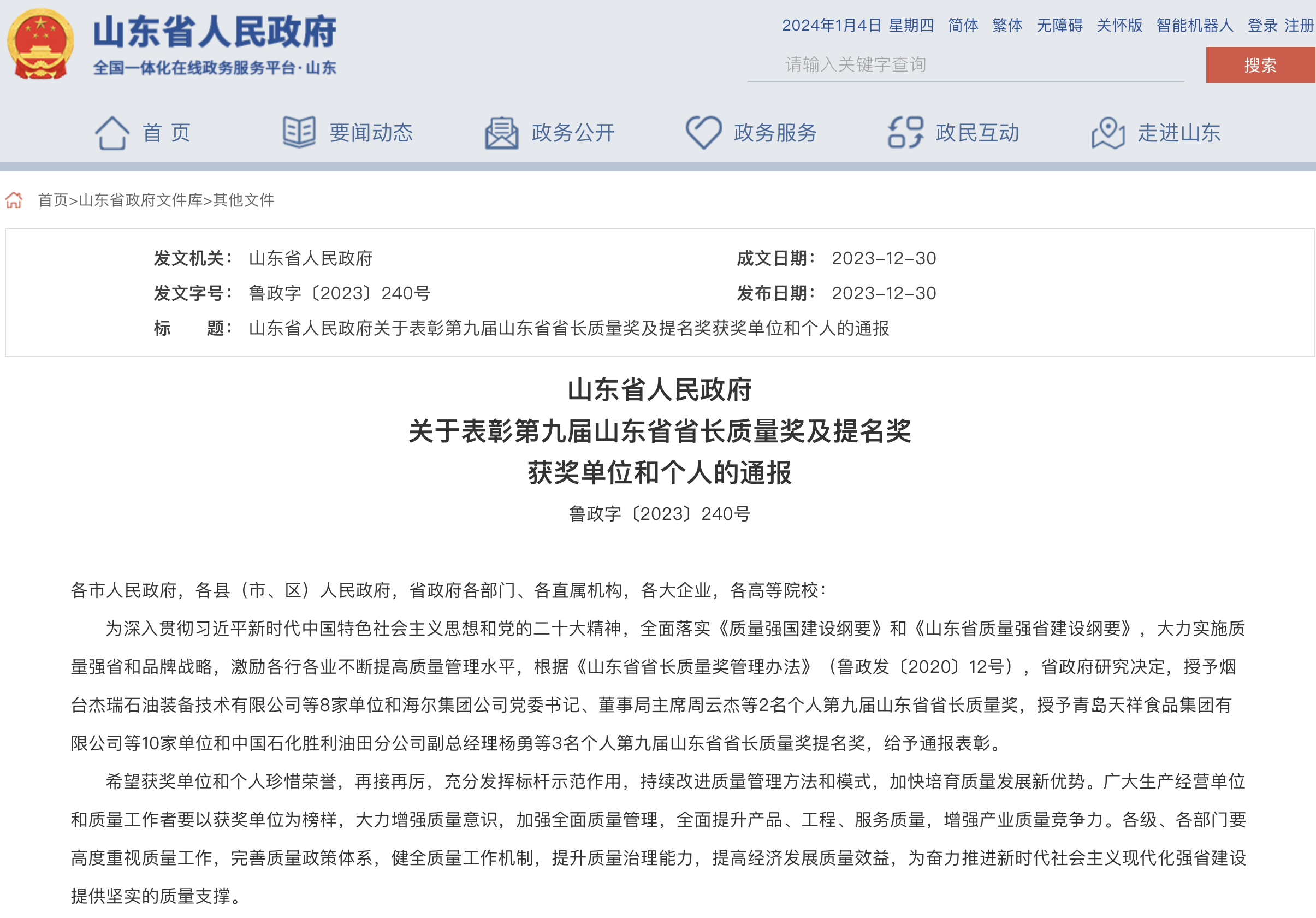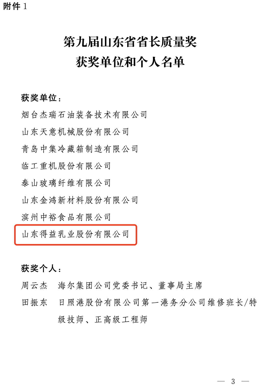 12月30日,山东省人民政府发布《关于表彰第九届山东省省长质量奖及提名奖获奖单位和个人的通报》,山东得益乳业股份有限公司凭借其卓越的产品质量和领先的质量管理模式荣获“第九届山东省省长质量奖”,实现了质量强企和质量强省建设的全新突破,成为推进山东省高质量发展的标杆力量。