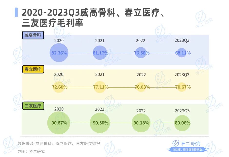 「不二研究」认为,不同的业务布局和业绩规模直接影响了各公司的盈利能力。威高骨科、春立医疗、三友医疗的毛利率有一定的差距。据各家财报显示,威高骨科2020年、2021年、2022年、2023年前三季度毛利率分别为82.36%、81.17%、76.58%、68.11%;同期,春立医疗的毛利率为72.60%、77.11%、76.03%、70.67%;三友医疗的毛利率为90.87%、90.50%、90.18%、80.06%。