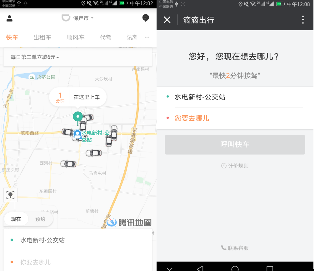 这导致小程序一定是轻为上,比如打开滴滴出行原生App可看到快车、出租车、顺风车等主菜单,主页还显示周边车辆等。滴滴出行小程序里的主页,就是最直接的出发地、到达地输入框与呼叫专车的按钮选项。所以说,小程序开发一定要以轻为主,只提供用户第一需要服务,而且设计上要尽量砍掉所有无关枝节。