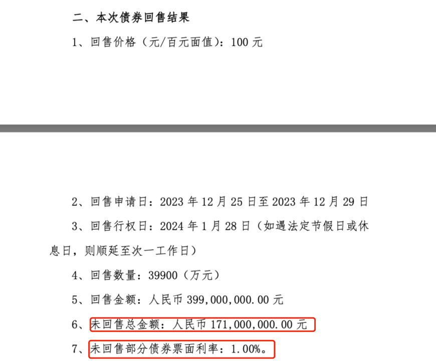 根据公告,投资人可于2023年12月25日至12月29日期间行使回售选择权,而未回售部分的票面利率将为1.00%。业内人士指出票面利率如此大幅下调至1.00%,一定程度上也是在“劝退”投资者,即让投资者行使回售选择权,尽量全额回售。