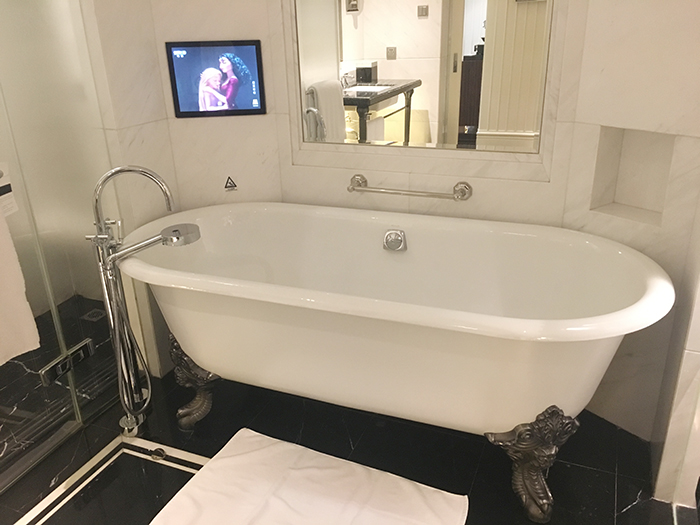 此次入住的市景房布局合理,不仅卫浴与居住空间进行了很好地区隔,小饮料吧台、步入式衣柜,都被分配了独立空间,让同住一室的亲密关系之间,也可以体面、互不干扰。客房风格既有现代的入住体验,又保留了原有的审美,比如欧式带装饰腿的大浴缸,和稳重简洁的洗手台。