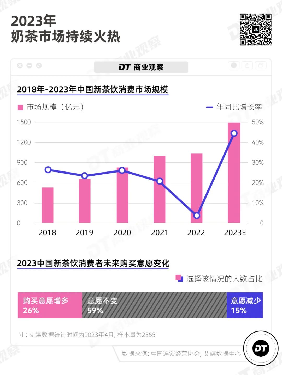 从行业来看,奶茶消费市场规模在2023年同比上涨了44.3%。