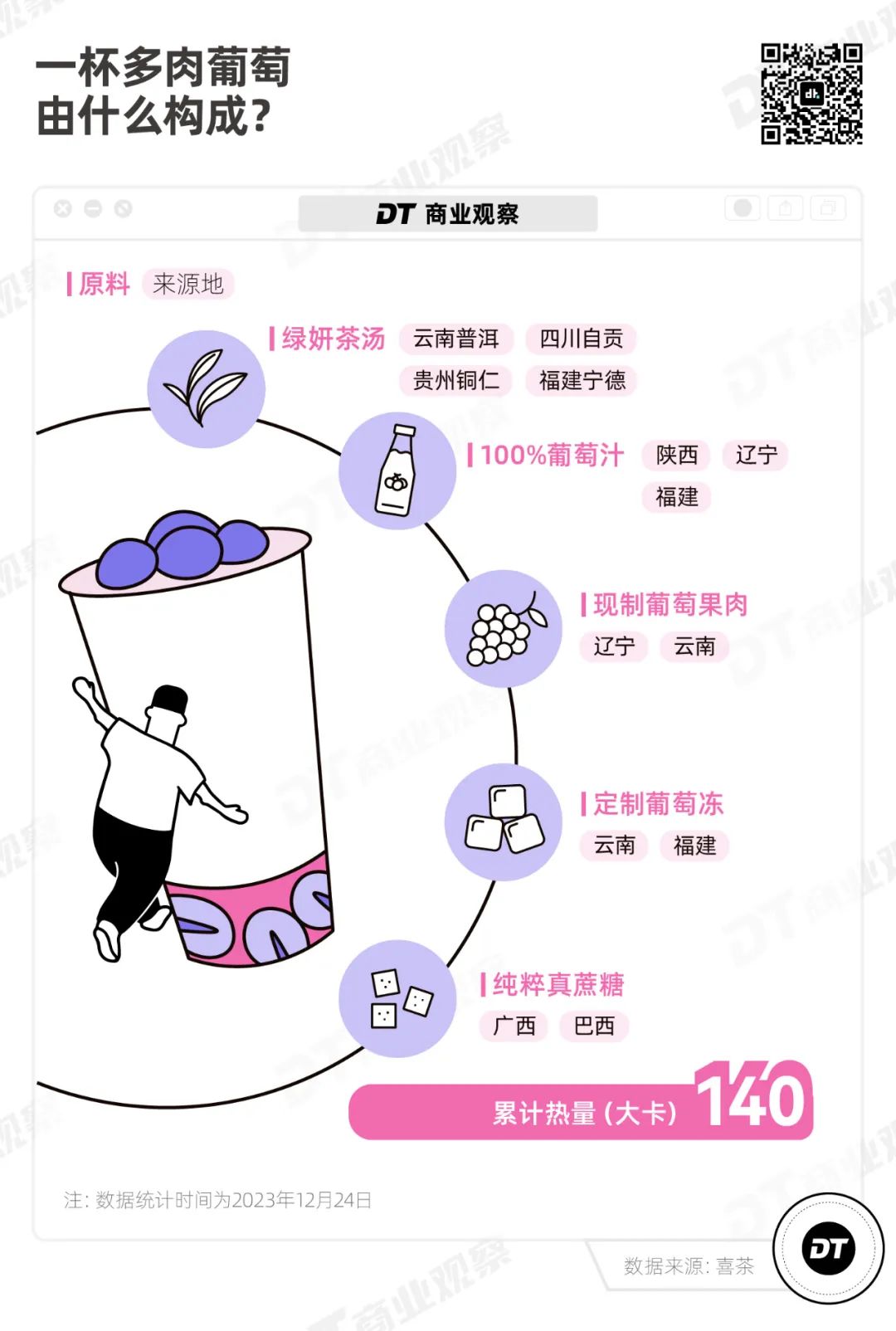 根据《喜茶2023年度报告》公开数据,今年喜茶“年度饮品”(最受消费者喜爱的饮品)的8款入选饮品中,有一半都是鲜果茶,分别是:多肉葡萄家族、酷黑莓桑、一大桶黄金桃和东坡荔枝饮。