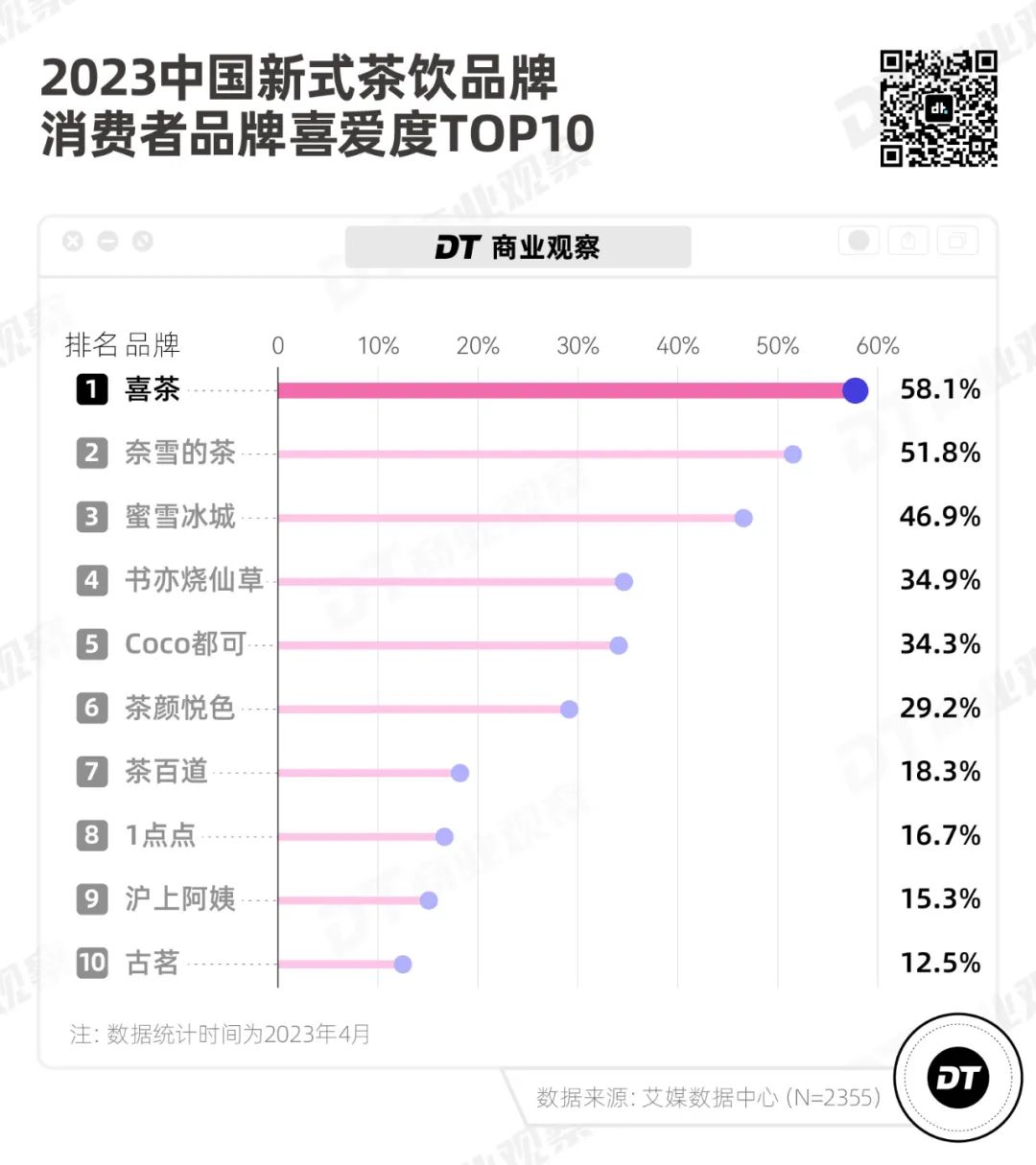 艾媒咨询数据显示,2023年新茶饮品牌消费者喜爱度调研中,喜茶以58.1%得票率位居TOP1。