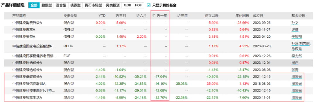 此外,周紫光在管的中信建投智享生活近一年收益率-32.70%,同类排名3354/3504;管理期限最短的,于2022年12月接管的中信建投科技主题6个月持有A,近一年收益率-42.08%,同类排名3488/3504。