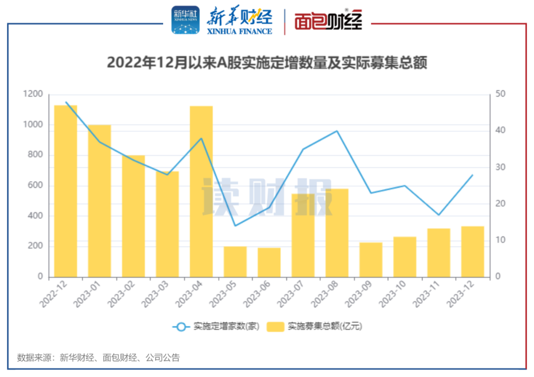 统计显示,2023年12月,A股上市公司共计实施定增28起,同比下降41.67%;实际募资总额约333.39亿元,同比下降70.47%。