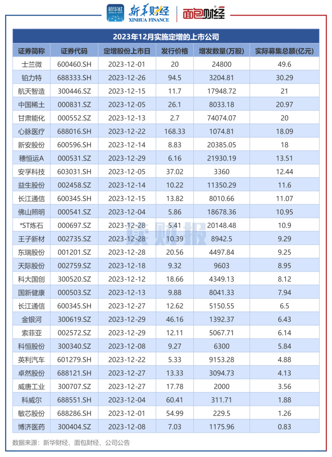 2023年12月实施定增的上市公司中,士兰微的实际募资额排在首位。士兰微新增股份数量为24800万股,发行价格为20元/股,实际募资总额为49.6亿元。