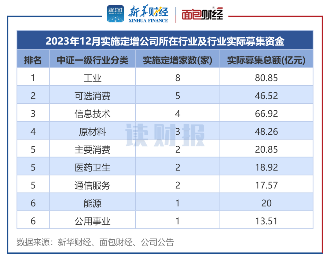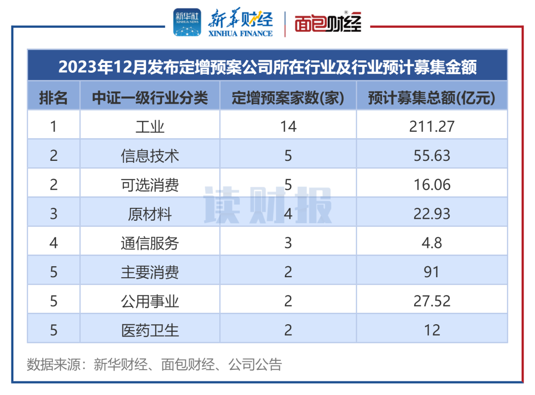 从行业分布来看,以中证行业统计,2023年12月,工业行业发布14起定增预案,拟募资额合计超211.27亿元,数量和金额均排在各行业之首;其次是信息技术行业、可选消费行业,均有5起定增预案。