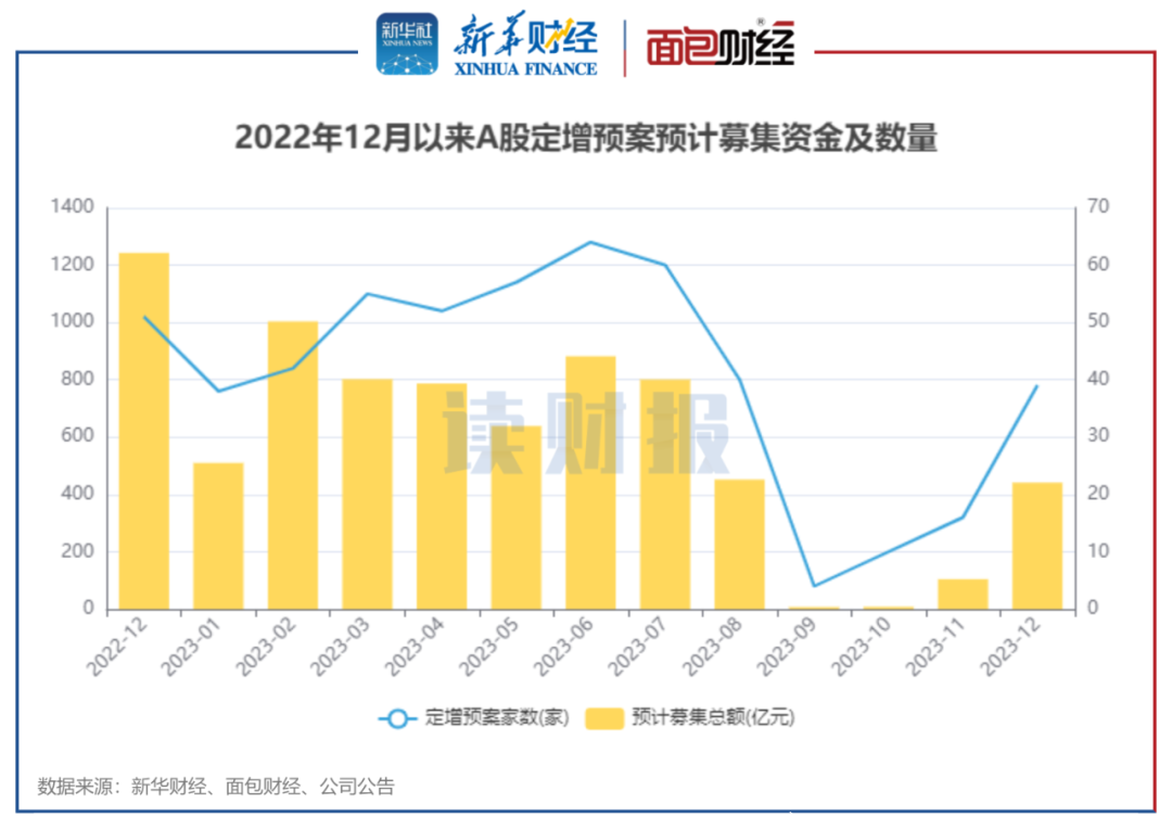 图4:2022年12月以来A股披露定增预案公司家数及定增拟募集总额