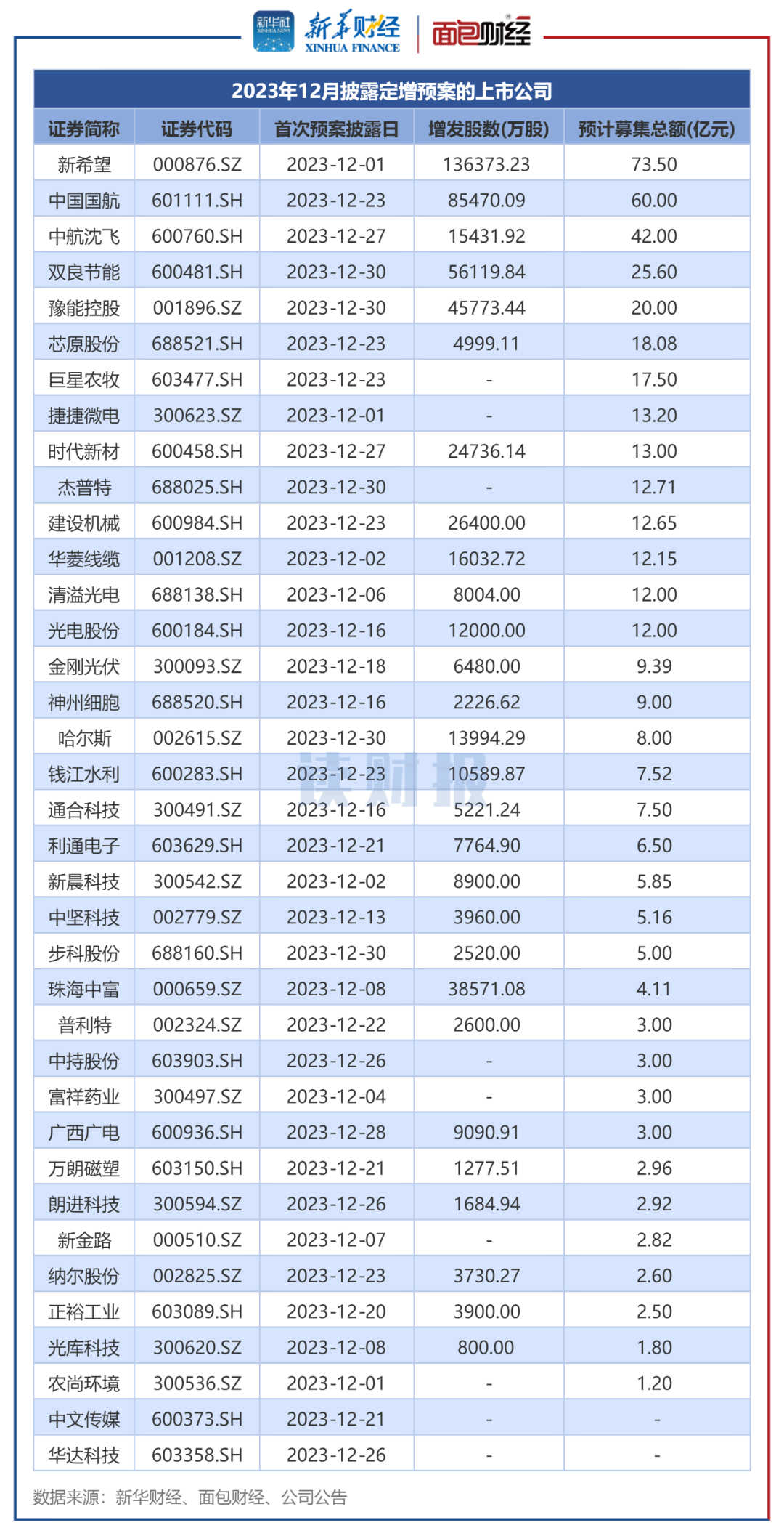 按照首次披露预案日口径统计,2023年12月A股上市公司定增预案发布数量共计37起,拟募资规模约441.21亿元,同比下降64.5%。其中,新希望、中国国航等企业拟募资规模相对靠前。