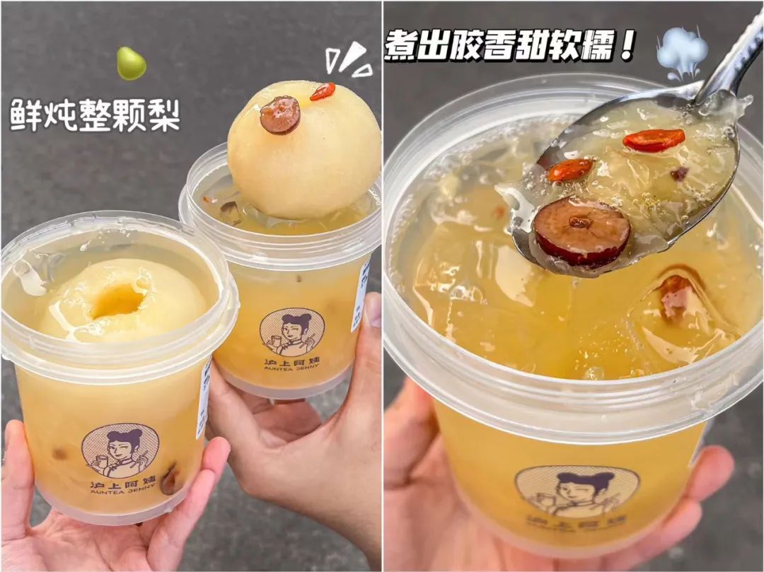 梨这个品类,结合年轻人的养生需求,是近两年冬季的“黑马饮品”。沪上阿姨在遍地“宝娟嗓”的时期推出鲜炖整颗梨,首月售出了266万杯,门店里的锅一度不够用。