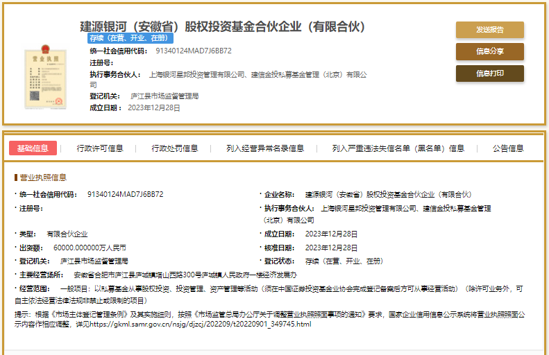 根据国家企业信用信息公示系统显示,日前,建信金融资产投资有限公司、中国银河投资管理有限公司等4家机构出资成立建源银河(安徽省)股权投资基金合伙企业(有限合伙)。据悉,该股权投资有限合伙企业主要经营场所为合肥市庐城镇政府经济发展办。