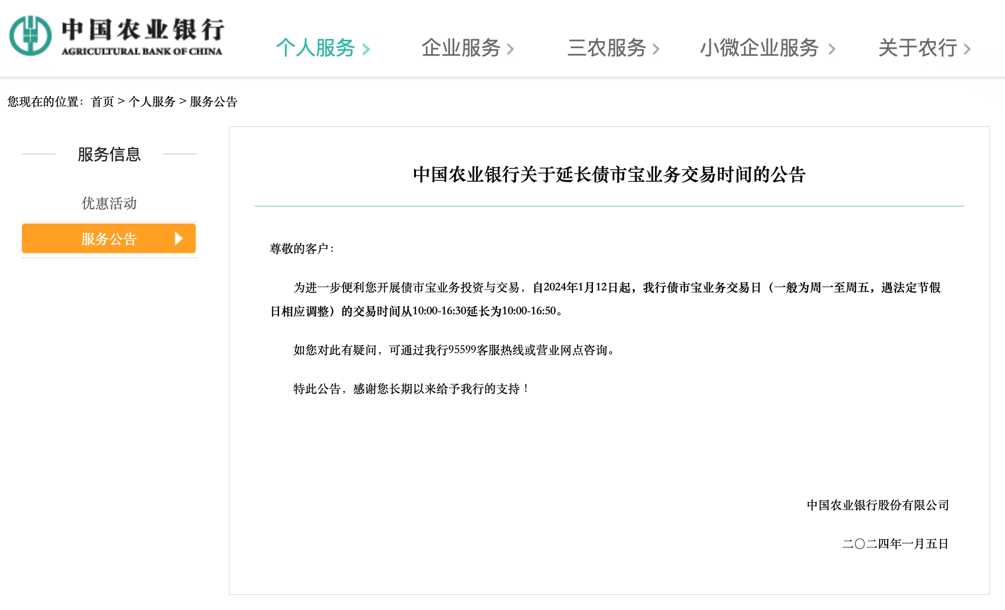 1月5日,农业银行发布关于延长债市宝业务交易时间的公告:自2024年1月12日起,我行债市宝业务交易日(一般为周一至周五,遇法定节假日相应调整)的交易时间从10:00-16:30延长为10:00-16:50。