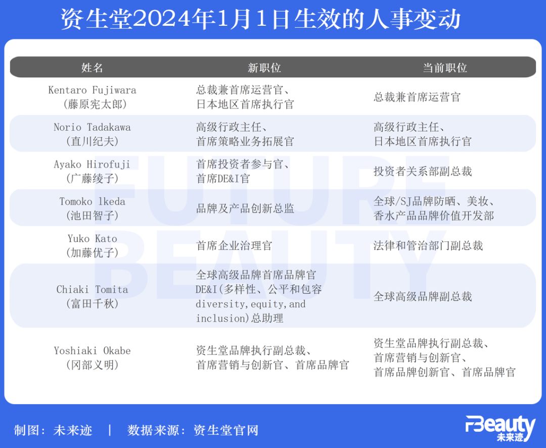 2023年11月,资生堂集团发布最新人事变动中,包含事关日本本土市场、投资、营销和产品开发等的7项新任命。其中,曾任资生堂中国CEO的藤原宪太郎,继今年1月1日升任资生堂社长、COO(资生堂集团总裁兼首席运营官)后,明年将在原来职务基础上,还担任日本地区首席执行官一职。