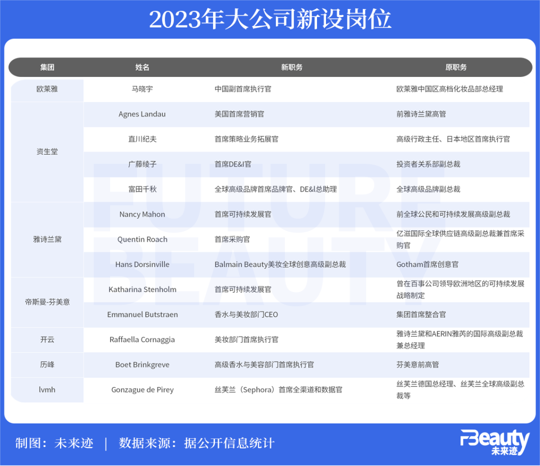 《FBeauty未来迹》统计发现,2023年欧莱雅集团、资生堂、雅诗兰黛、帝斯曼-芬美意等7家国际公司共设立了13个新职位。