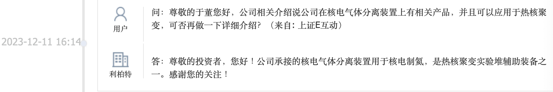 界面新闻记者注意到,在2023年12月,利柏特曾在互动平台表示:公司承接的核电气体分离装置用于核电制氦,是热核聚变实验堆辅助装备之一。