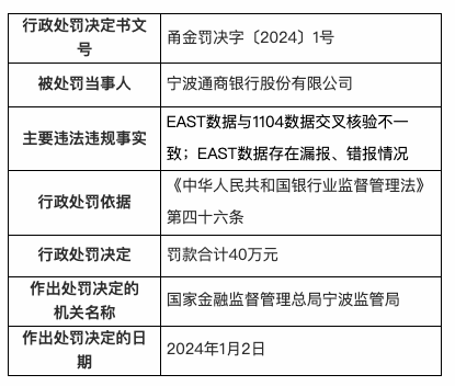 1月5日,国家金融监督管理总局宁波监管局行政处罚信息公开表显示,宁波通商银行股份有限公司,被处罚款合计40万元。主要违法违规事实为:EAST数据与1104数据交叉核验不一致;EAST数据存在漏报、错报情况。