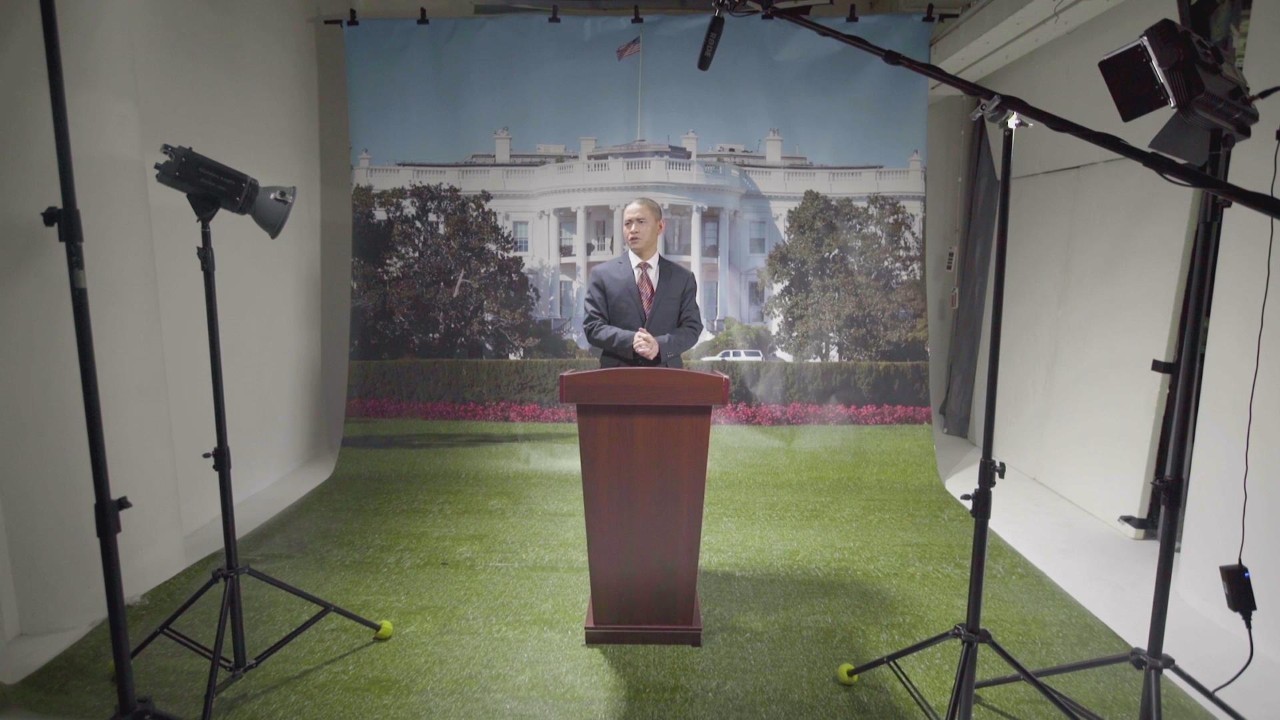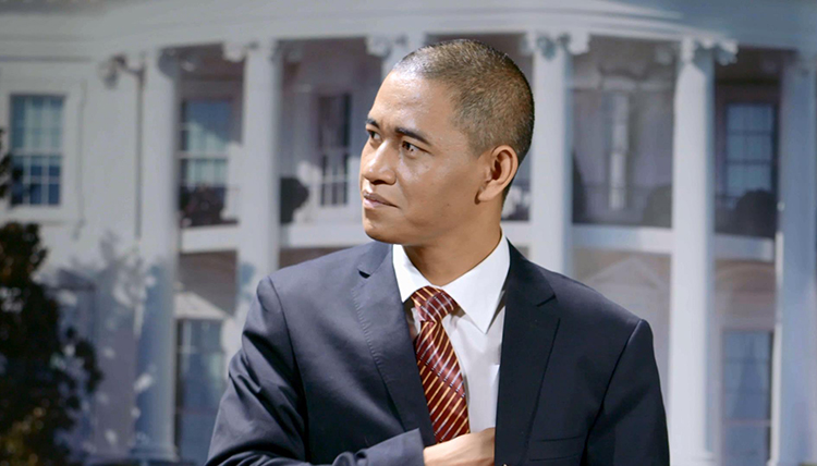 场地布置好后,肖基国穿着一身西装,笔挺地站在我们打印的白宫背景纸前。他双手交叉放在胸前,皱着他自己画的浓黑眉毛,张口就来了一串谁都听不懂的假英文。我们大呼:“太像奥巴马了!”肖基国笑着回了句:“靠脸吃饭。”