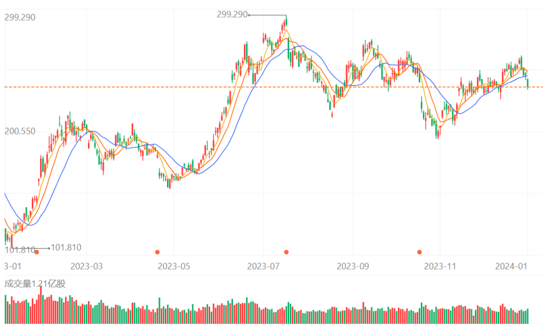 不过,让比亚迪尴尬的是,虽然销量涨了一年,但股价却跌了一年。其2023年2月股价达到全年最高的304.99元/股,但随后开始下跌,至12月股价出现全年最低的182.85元/股。截至1月4日,比亚迪股价微跌0.08%,收盘价193.02元/股。