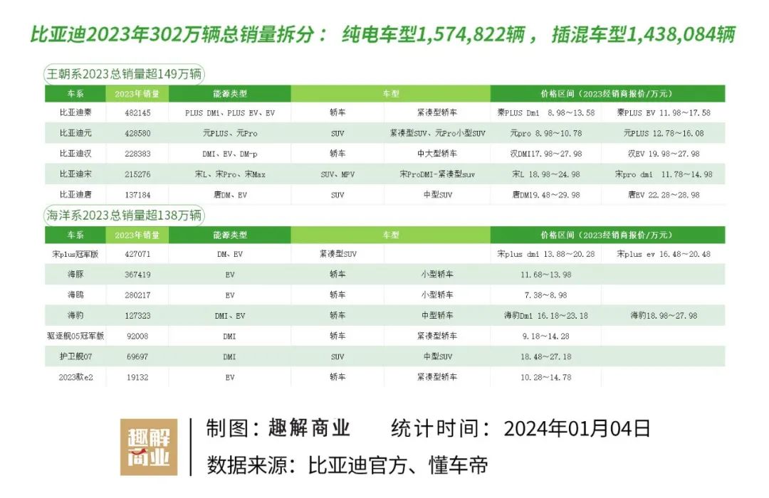 2023年,比亚迪全年卖出的新能源车超过302万辆,其中纯电车型销量略高于插混车型销量,分别是1,574,822辆和1,438,084辆。