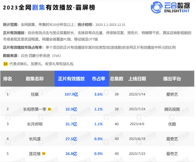 其二,作为这几年的剧集标兵,爱奇艺稳定领先。云合数据 2023全网剧集有效播放TOP20中,爱奇艺占据11席,腾讯视频9席,优酷占据6席。具体来看TOP5,爱奇艺的《狂飙》断层领先,《长风渡》和《莲花楼》同在齐列。