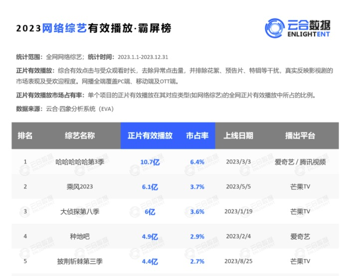 2023年综艺市场的“清冷”,透过头部内容便可一窥究竟。云合数据显示,2023年有效播放前两名的《奔跑吧7》《五哈3》较之2022年的TOP2出现了下滑,更难以和此前综艺鼎盛时期相提并论。但也正是如此,平台布局和复盘才显得愈发重要。