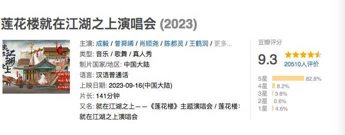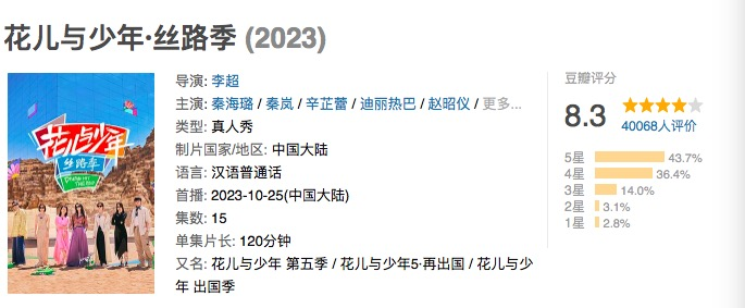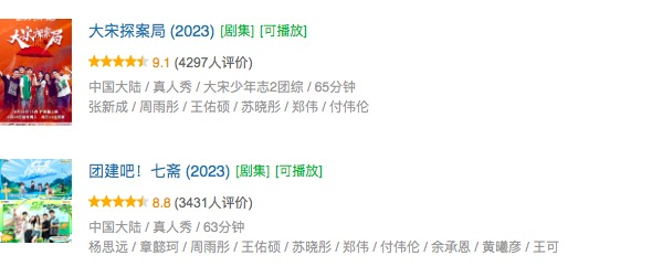 其他的,在经典综艺越来越常见的回归潮中,芒果TV今年凭借着《全员加速中2023》实现了热度领跑,《花儿与少年》则在今年的“丝路季”实现了口碑上行,豆瓣评分高达8.3分。再比如人文赛道,优酷凭借着《第一人称复数》《锵锵行天下3》等多部豆瓣超9分的作品收获了市场认可。