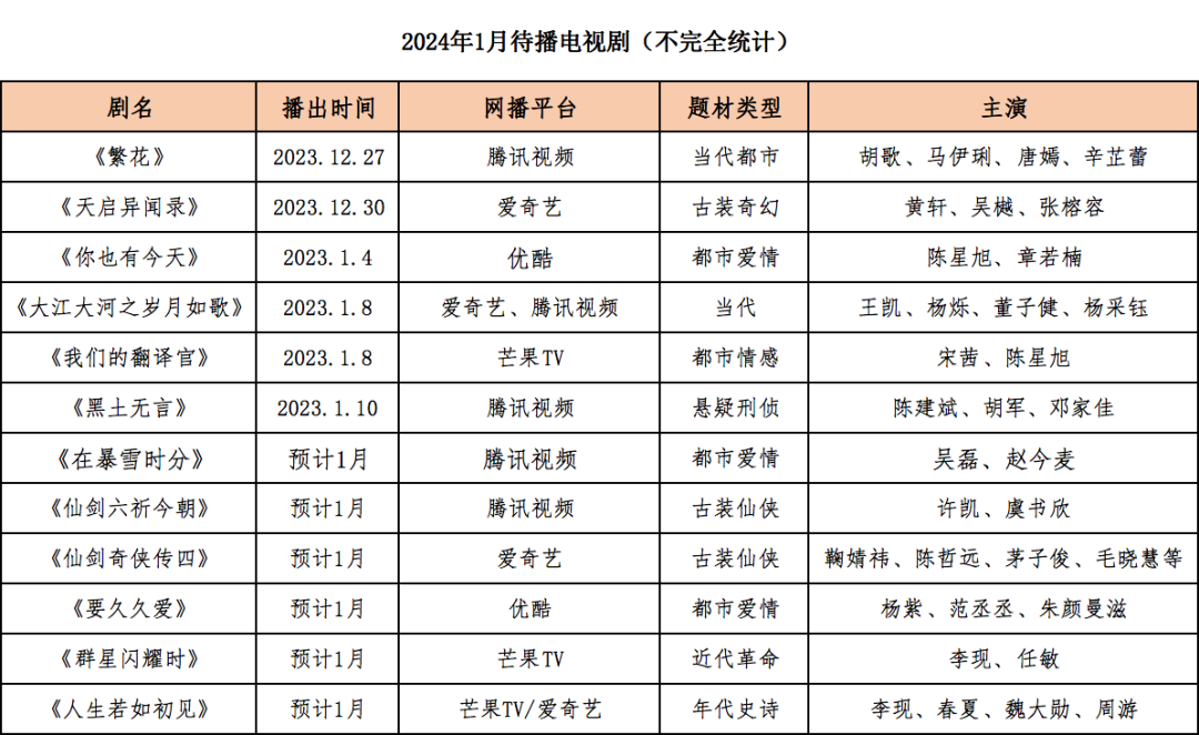 如今2024的开年档角逐已拉开序幕,根据不完全统计,四大长视频平台目前正在热播或已定档以及预计在1月播出的剧集在12部左右,题材类型涵盖了现实主义、都市爱情、古装仙侠、近代革命、悬疑刑侦等,呈现出“多点开花”的特点。