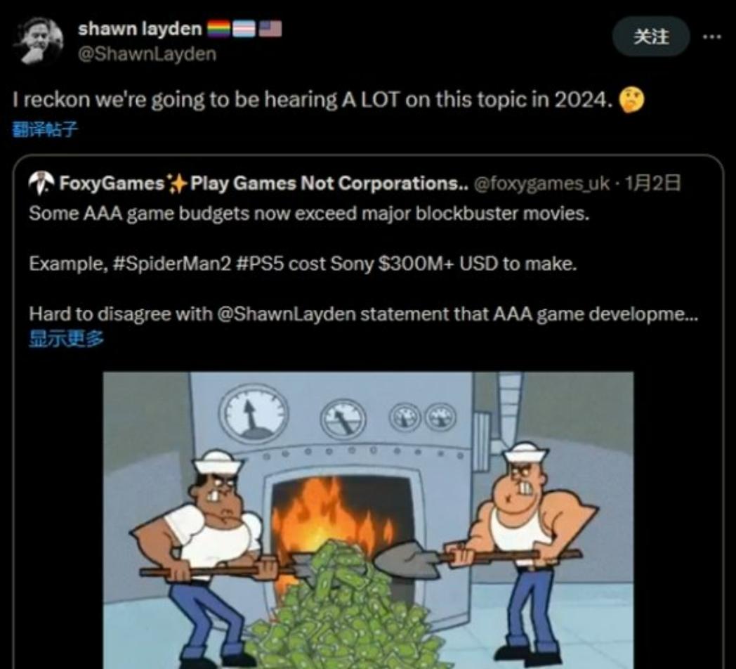 索尼互娱美国分部前首席执行官 Shawn Layden 在 X 平台转发了一条有关游戏制作成本的帖子,并称“我估计,2024 年我们会听到很多关于这个话题(指游戏成本上升)的讨论”。