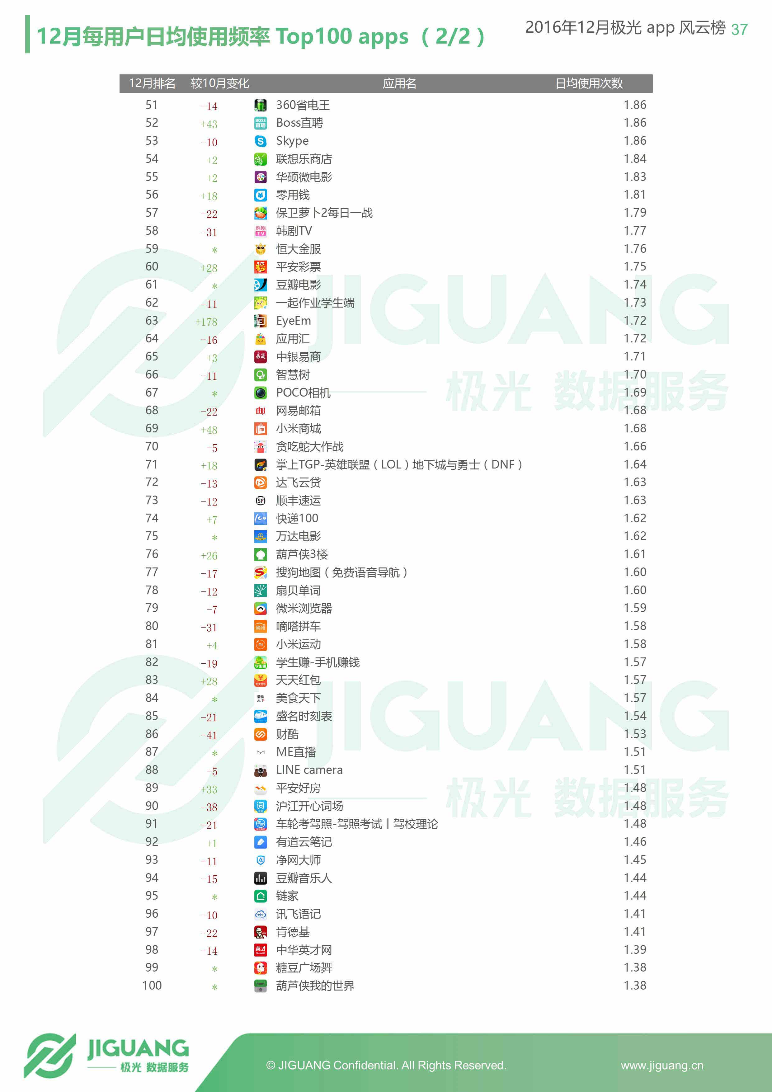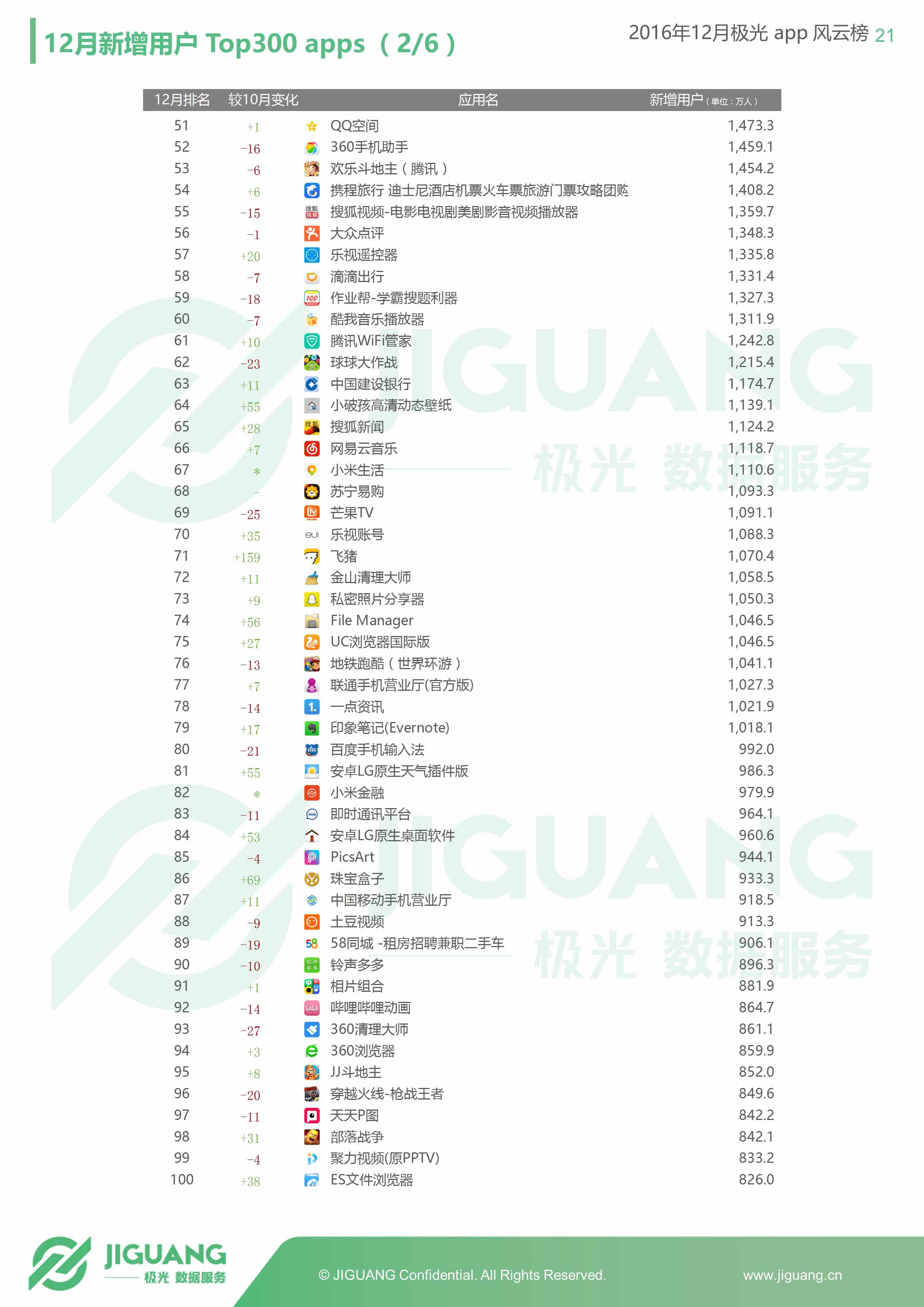 - 小米生活和小米金融分别以1110.6万和979.9万的新增用户量跃居 top100,成为本月新增用户榜单两匹最大的黑马,或由于11月发布的新品红米4和红米4A拉升安装量