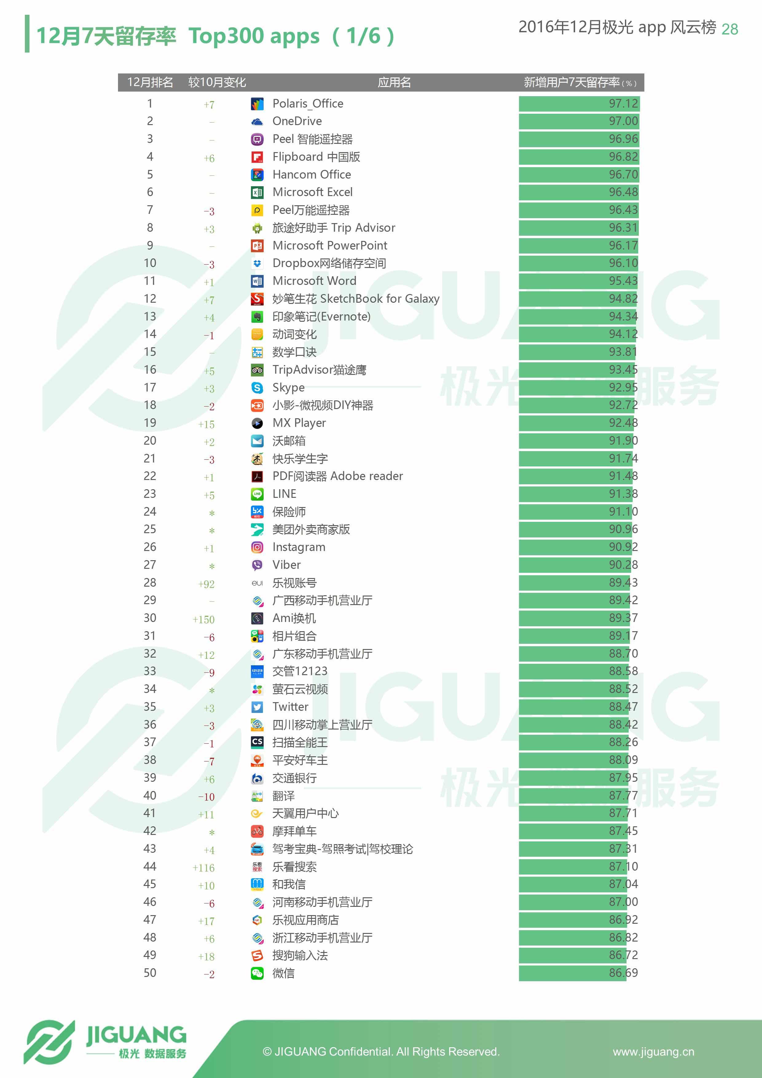 - 极光大数据显示,本月7天留存率新入榜的 app 有 保险师、美团外卖商家版和萤石云视频等27款,跌出榜单的 app 有传输数据、畅读等22款