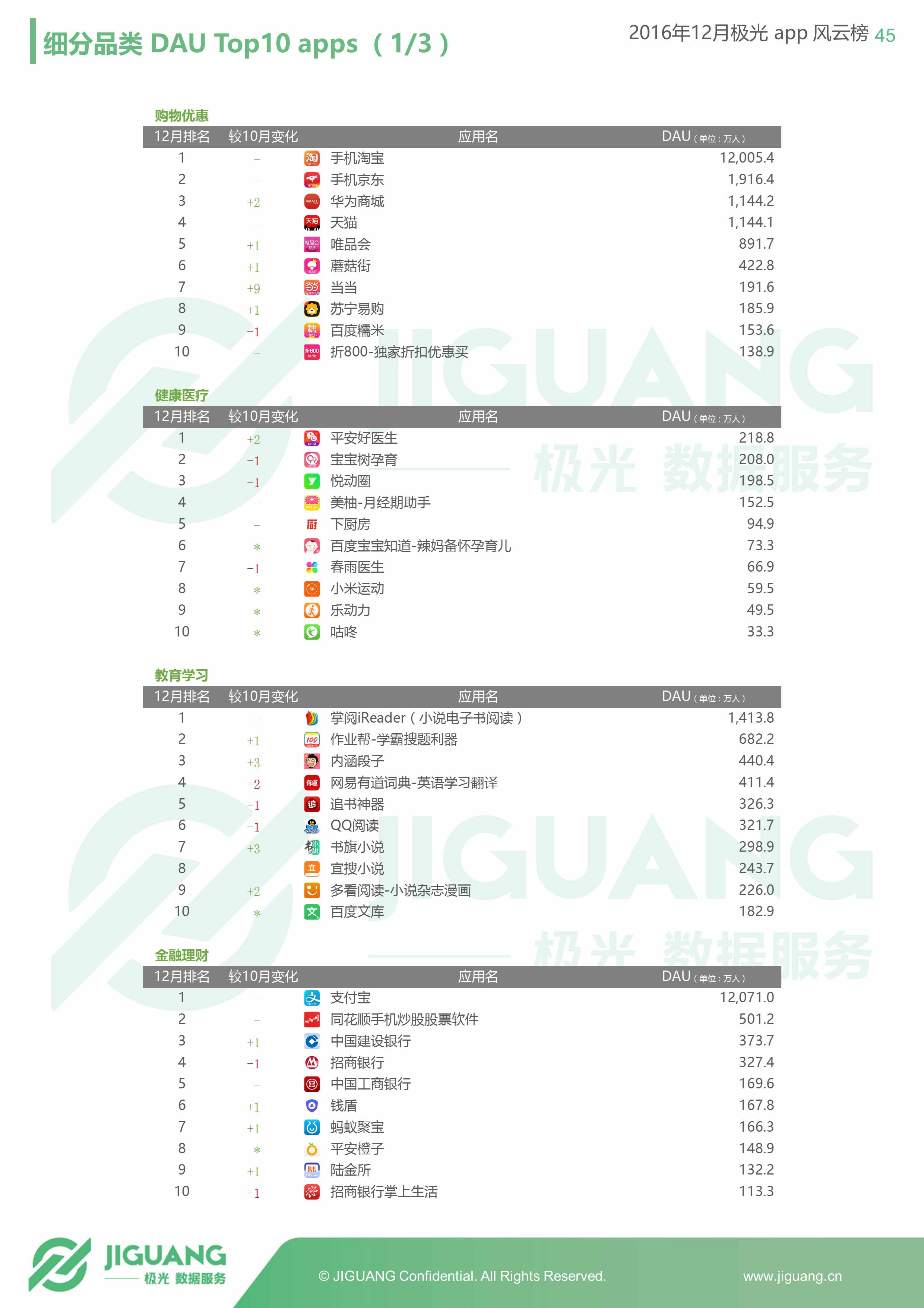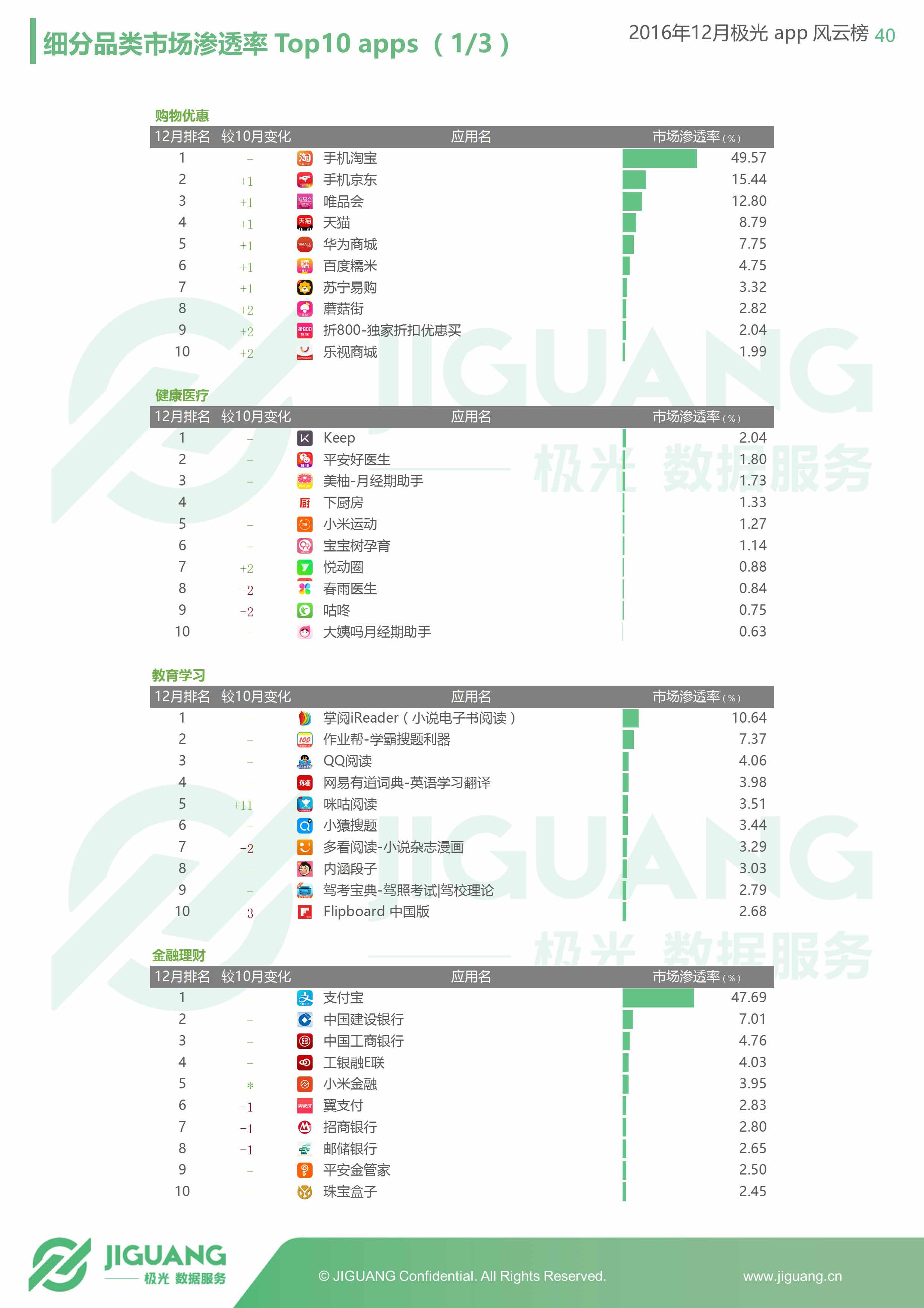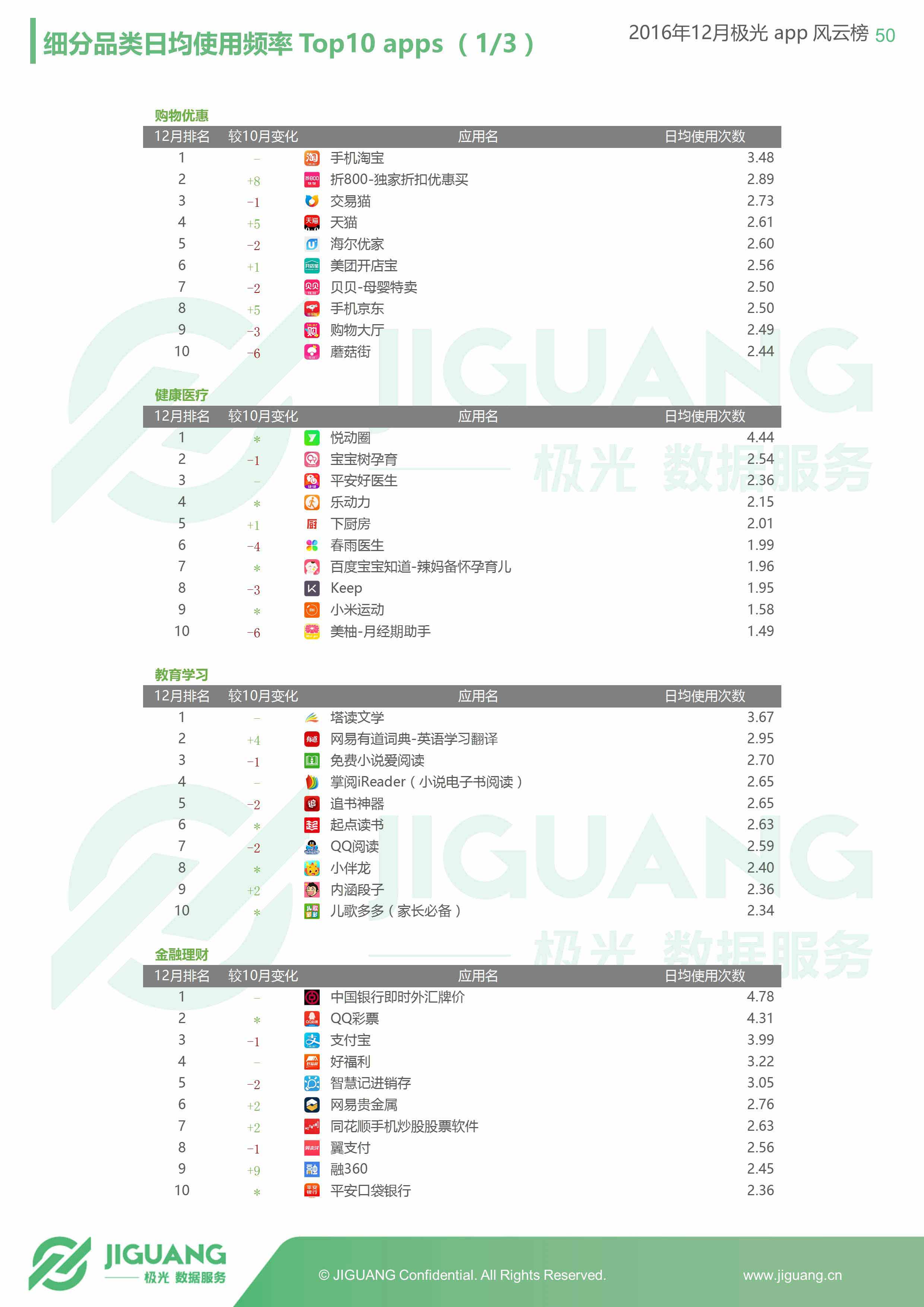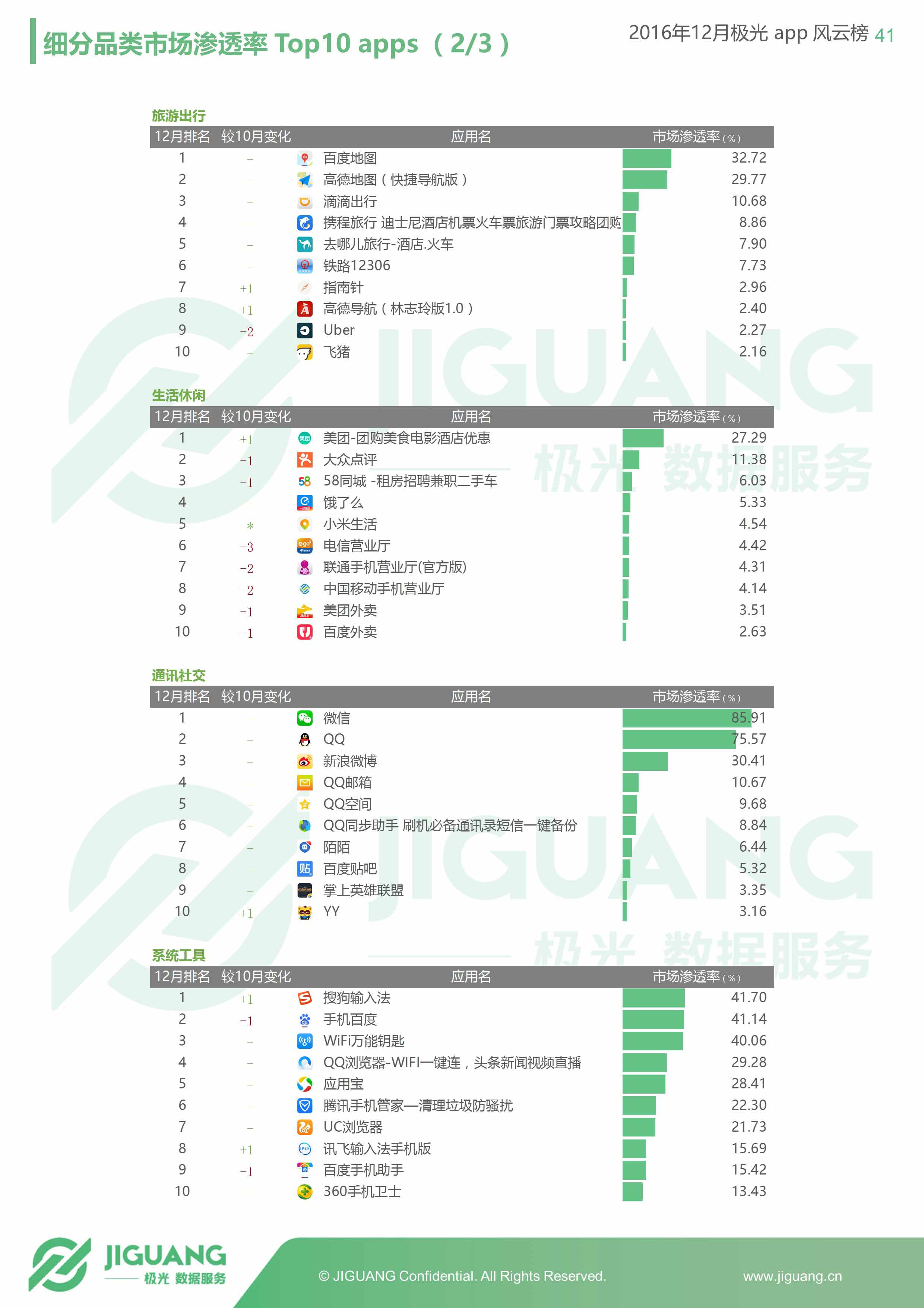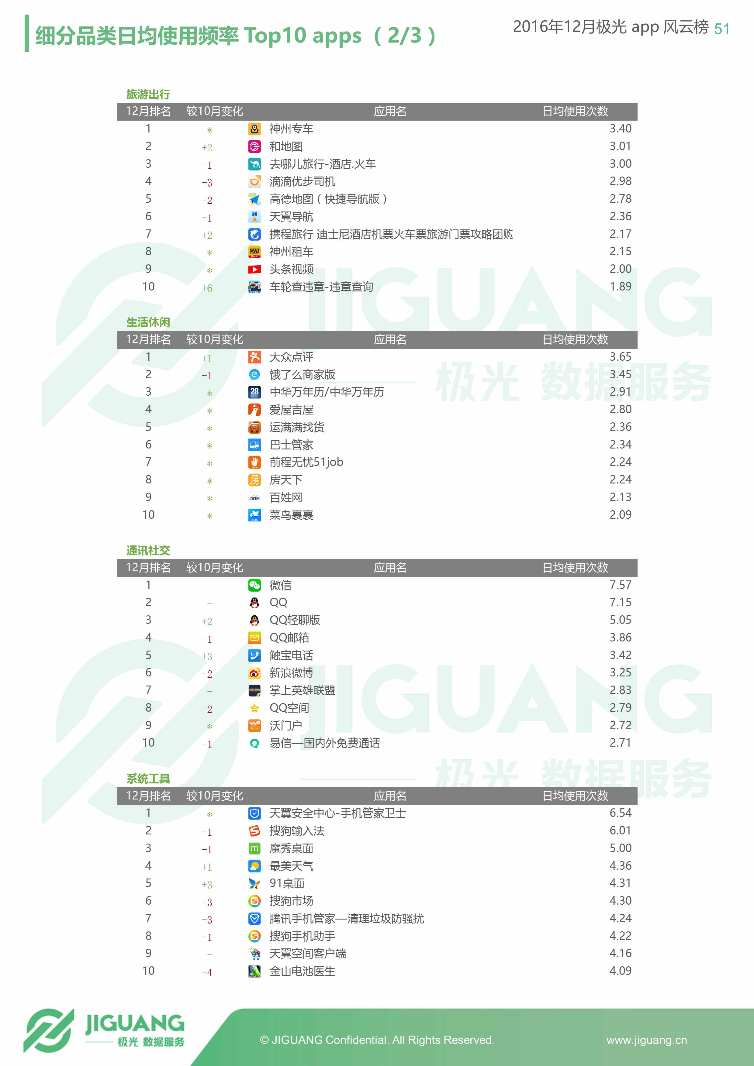 - 2016年下半年的网红非共享单车品类莫属,摩拜单车无疑是该领域的佼佼者,以0.88%的渗透率位列12月渗透率榜单的352位,同时新用户7天留存率为87.5%,这部分新用户有望成为摩拜单车忠实用户