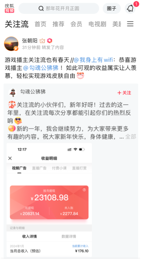 “关注流”的形式下,只要用户在搜狐视频生产的视频和直播有人气、有流量,就能够获得收入,张朝阳表示,搜狐视频有独特的商业模式,用户只要发布短视频、经常活跃与他人互动积累流量,就能通过展示平台广告获得分成收益。