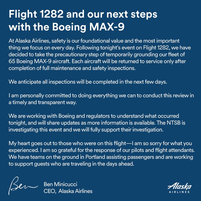 当地时间1月5日晚,阿拉斯加航空(Alaska Airlines)就此前事故声明称,安全是公司的基本价值观,也是最重要的事情。公司决定采取预防措施,暂时停飞机队的65架波音737 MAX 9飞机。每架飞机只有在完成全面维护和安全检查后才能恢复飞行,预计所有检查将在未来几天内完成。此外,公司正在与波音公司和监管机构合作,以了解今晚发生的事件。