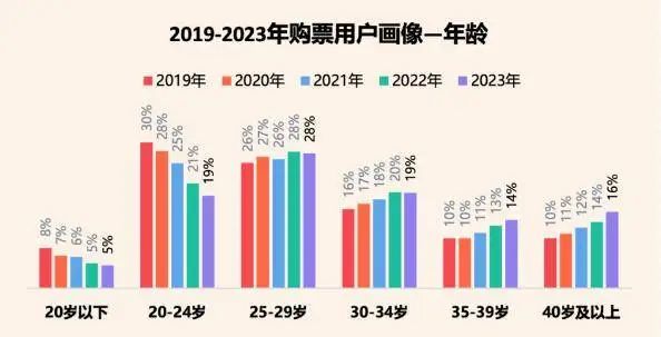 数据对比则更为直观。20岁以下群体,2019年占比为8%,2023年连续下降跌至5%。20-24岁这一群体,2019年占比为30%,2023年连续下降已经跌至19%。这代表着24岁以下这个最“年轻”的观影群体,正在流失。