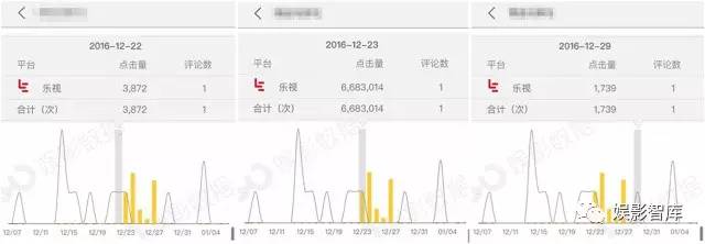 娱影数据系统上显示,乐视独播的某影片在上线三个多月,日均点击量已经稳定在5k上下的时候,突然开始玩起了心跳。在12月23日当天,该片的日点击量一下子蹦到了668万,这种神州不知道多少号的飞天式增长一直持续到了28日,在这六天之内甚至出现了日点击量破千万的情况。然而到了12月29日,该片的日点击量又极速坍缩至1.7k,只是淡淡地在江湖上留下一段传奇。
