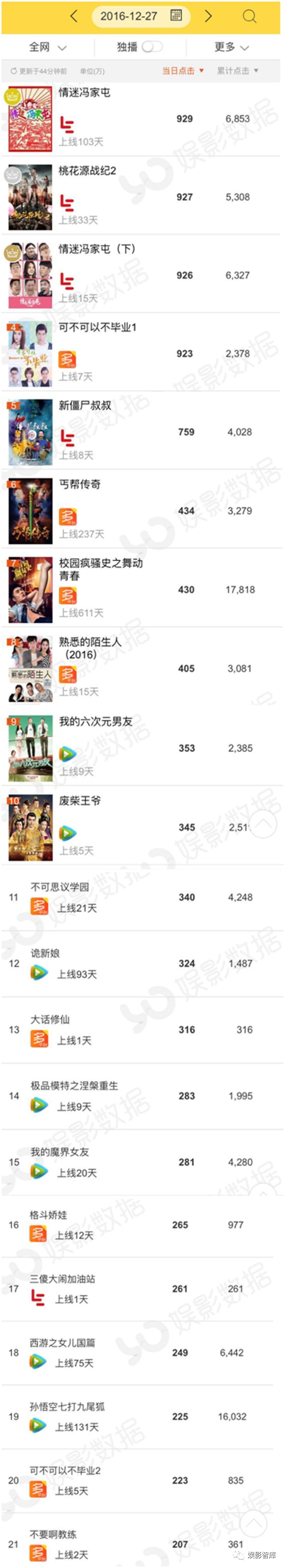 再以12月27日的播放量为例,该日全网播放量达1.76亿,成为一周最高单日播放。娱影君仔细研究了一下,发现这一方面与前日上新影片数量较多有关,而另一方面多部影片在上线一段时间之后播放量突然出现大幅增长。《情迷冯家屯(下)》当日播放量达926万、《桃花源战纪2》926万、《可不可以不毕业1》923万、《新僵尸叔叔》759万、《校园疯骚史之舞动青春》430万(其中乐视415万)、《诡新娘》324万等。这些网大要么是腾讯和乐视两个平台的独播,要么是多平台播放,而多平台上的播放量主要来自这两个平台。