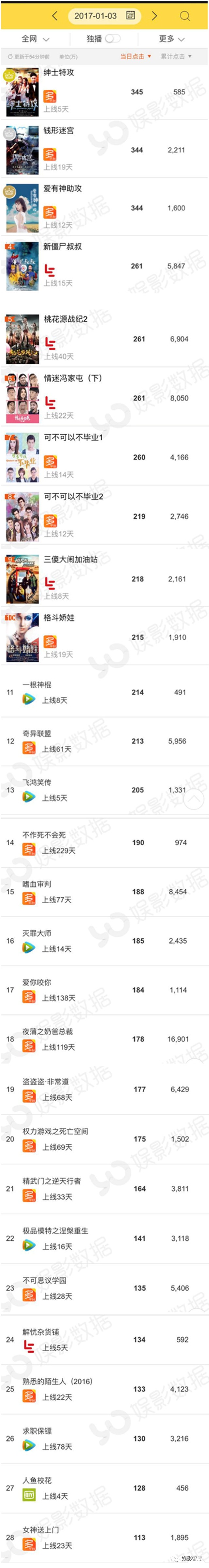 不仅如此,在2017年1月3日的日排行榜中娱影君惊讶地发现,排名前26的影片全部都是腾讯、乐视独播影片或多平台影片(当然,主要播放量贡献还是来自这两个平台)。爱奇艺新片《人鱼校花》以128万的点击量排名第27名。