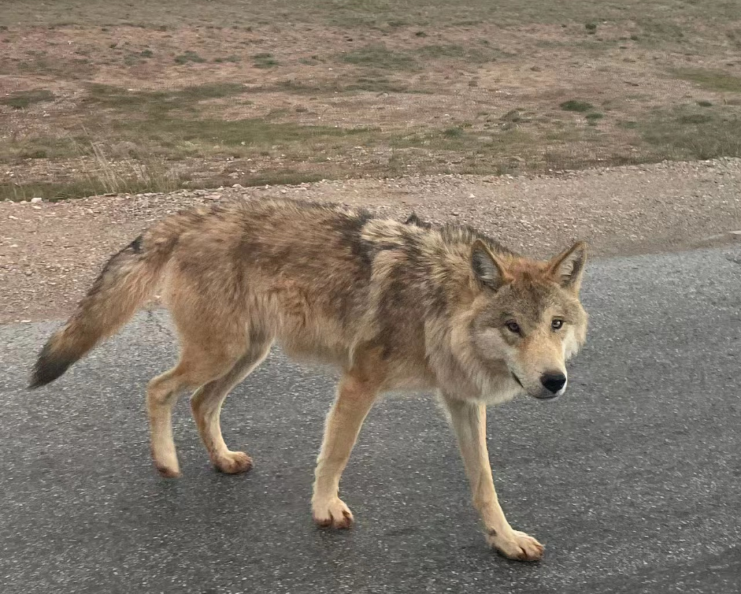 去年12月14日中午11点多,途经无极龙风宫,再过昆仑山口,可可西里网红狼出现了。看到狼,团里的两名游客激动得尖叫:“真的看到了网红狼!”