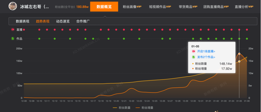 现在10万+在线观众已经成了左右哥直播间的常态,左右哥账号粉丝数也随之暴涨。截至1月7日晚上8时25分,“冰城左右哥”账号粉丝数已经达到202.4万。而在12月18日,冰雪大世界刚开园时,左右哥的账号粉丝数仅57万,短短20天,粉丝涨超145万。