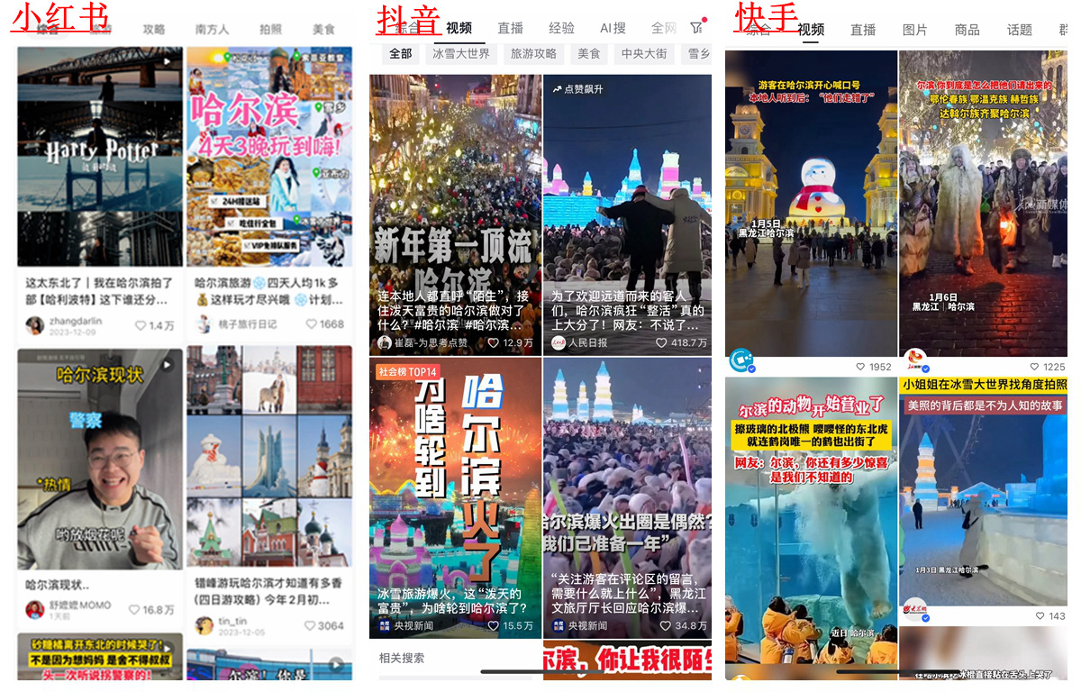 抖音上仅《人民日报》2024年1月3日发布的哈尔滨文旅“整活儿”视频,点赞量就近400万;其他大量关于哈尔滨旅游、“南方小土豆”的哈尔滨经历等视频点赞量在10万至60万不等。快手带哈尔滨标签的视频累计播放量近100亿,多个相关视频热度飙升。
